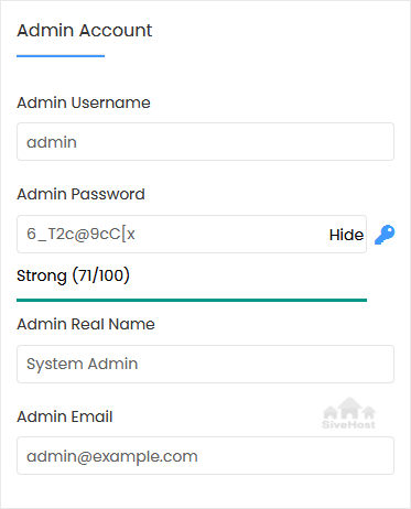 • Admin Username: Your new Contao username (for security reasons, do not use the administrator or the admin username).