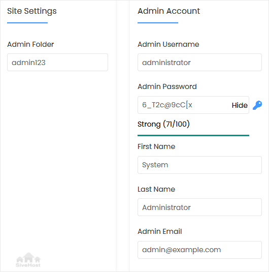 • Admin Username: Your new OctoberCMS username (for security reasons, do not use the administrator or the admin username).