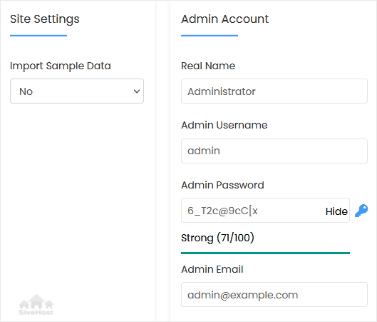 • Admin Username: Your new PluXml username (for security reasons, do not use the administrator or the admin username).